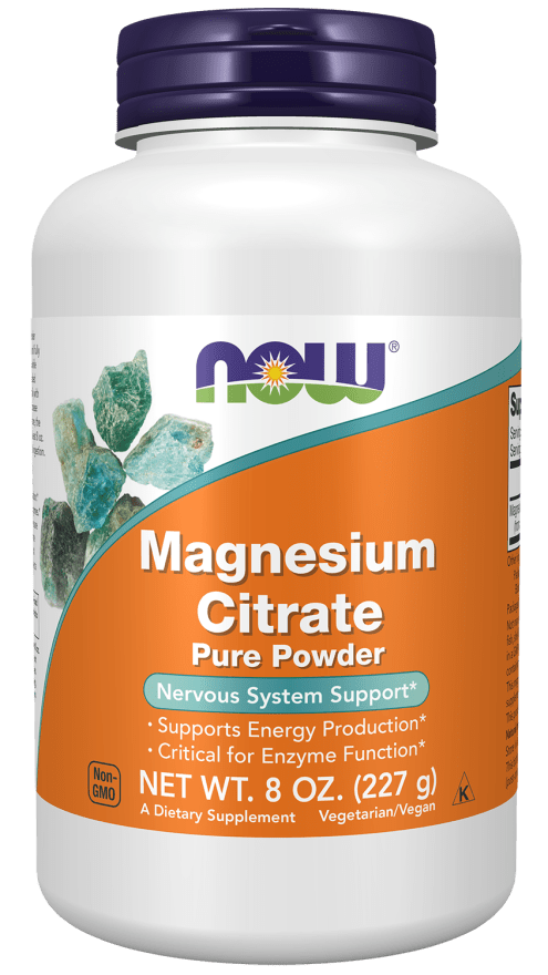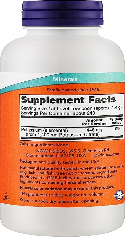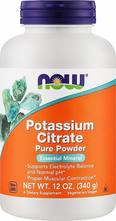 Potassium Citrate Powder da NOW Foods (340 g) — mineral essencial que promove equilíbrio de fluidos, pH, função cardíaca e contrações musculares. Fórmula vegana e sem OGM.